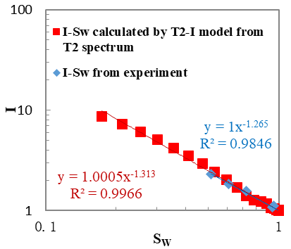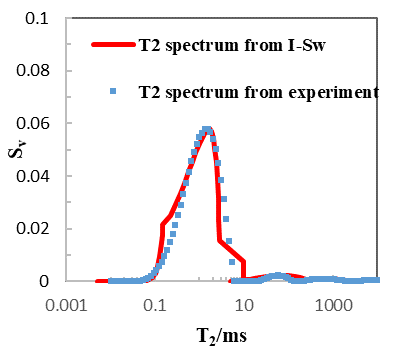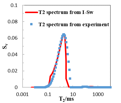 图3是采用T2-I模型对火成岩岩心实验数据的验证,采用T2分布可以计算得到电阻率数据I-Sw曲线,同样,采用I-Sw实验数据,也可以计算得到核磁T2分布,计算结果与实验结果基本相符。
