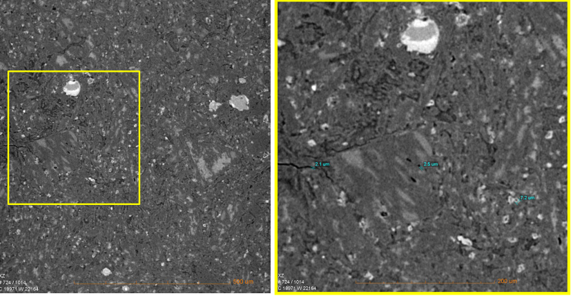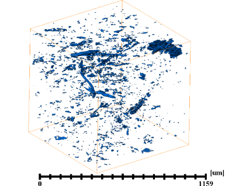 图1采用体素分辨率(1μm)扫描玄武岩数字切片,观察到2.1微米的微裂纹和2.5微米的孔隙;观察到7.2微米的高密度矿物颗粒。