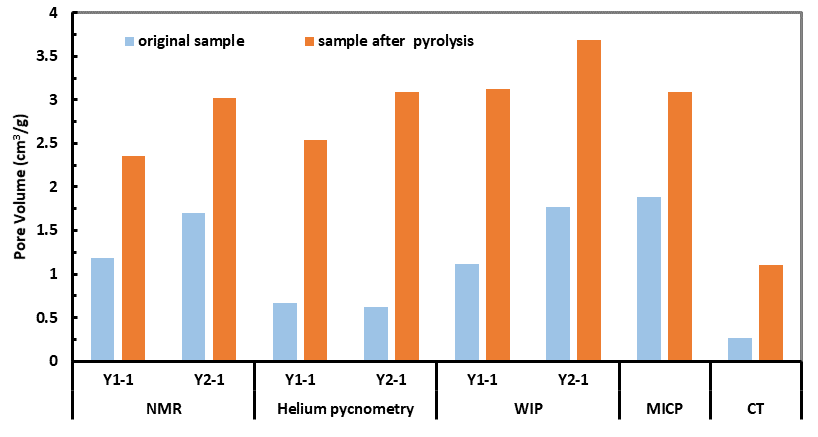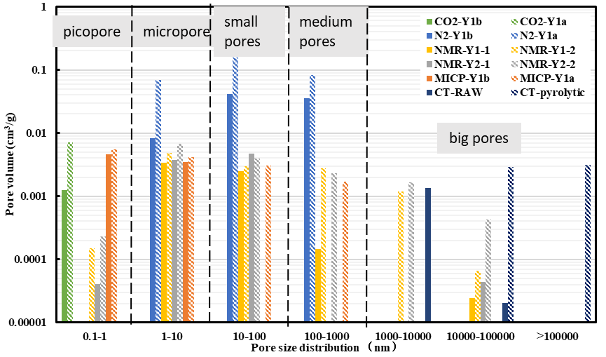 本研究采用的各种方法测量的孔径分布(PSD)范围在0.1 ~ 106 nm之间。按数量级采用不同尺度的7个层次进行比较(图6)。从而直观、准确地分析油页岩孔隙结构特征,并在不同尺度上评价热解对孔隙结构的影响效果。由图13可知,CO2吸附法测量的PSD小于1nm, N2吸附法测量的PSD在1-1000nm之间,NMR法测量的PSD在0.1-100000nm之间,MICP法测量的PSD在0.1-100nm之间,CT法测量的PSD大于1000nm,这与CT扫描的分辨率有关。本文选取的CT扫描分辨率为2(原始样品)和11.47um(热解样品)。