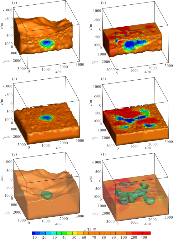 (a)、(c)和(e)为考虑地形的反演结果;(b)、(d)和(f)为考虑地形的反演结果