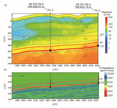 黑色带箭头虚线为探井,蓝色线条为根据测井信息推测的地层分布L1-L7,红色线条为煤层。