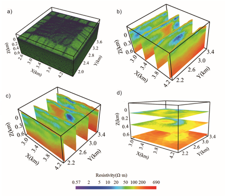 电磁探测数据受起伏地形影响严重,忽略其影响会造成反演结果的畸变。传统的电磁探测数据三维反演均基于规则六面体网格剖分,无法精细刻画起伏地形,会带来一定的正反演误差。为提高复杂起伏地形条件下的电磁探测数据反演精度,永利yl23411殷长春教授的电磁探测技术研究组开展了基于非结构四面体网格剖分的电磁探测数据三维正反演研究。经过十年的发展,提出了面向目标自适应网格加密、区域分解、局部网格和三重网格灵敏度快速计算等高效算法,发表相关论文数十篇。目前已经形成可处理多种电磁探测数据的三维正反演解释平台GEM3D,在国内外相关行业进行了推广,并获得了广泛好评。