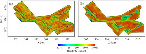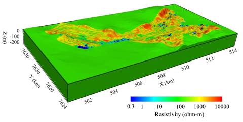 图5 挪威石墨矿区频率域航空电磁三维反演结果