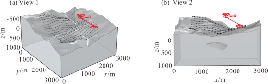 图1所示为一典型起伏地表地区航空电磁探测示意图。从图2中可以看出,考虑起伏地形影响的反演可精确恢复地下异常体的位置、大小和电阻率,而不考虑地形的反演效果地下低阻异常的分布形态、深度和大小等与真实情况差异很大,说明起伏地形的精确刻画在电磁探测数据解释中具有重要作用。图3a所示为某煤田地区地面大回线源瞬变电磁数据三维反演模型剖分网格示意图,地表附近的精细网格很好地刻画了真实的起伏地形。图3b、3c和3d为三维反演结果在不同方向切片,其中深部高阻灰岩起伏情况和浅部含水层等与地质情况对应很好。图4中瞬变电磁反演结果中浅部几个地层与测井信息推断地层对应较好,而深部灰岩起伏情况与地震解释结果基本一致,说明GEM3D的反演结果准确可靠。图5所示为挪威石墨矿区的频率域航空电磁三维反演结果。从图5中可以看出该地区地形起伏较为严重,而非结构四面体网格剖分技术很好地拟合了该地区的地形。从反演结果的水平切片中可清晰识别低阻矿脉的位置、形状和电阻率大小。这些低阻矿脉与该矿区的地表出露矿体吻合很好,进一步证明了我们反演技术的可靠性。