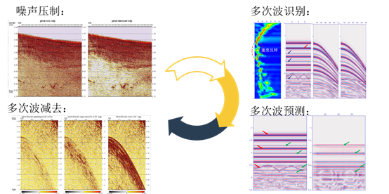 由于海水深度变化加大,深水地区常存在地层速度反转、海底结构崎岖等现象,层间多次波、绕射多次波等复杂多次波发育严重,常规单一的多次波去除方法难以满足深水地震勘探的要求。多次波与目标层位一次波耦合,严重影响了成像效果及进一步的油气评价及分析。由于目标层位信号能量较弱,迫切需要建立高保真、有针对性的多次波压制技术系列,以支撑深水地震勘探的中深层精确成像。