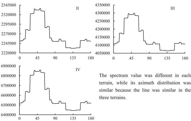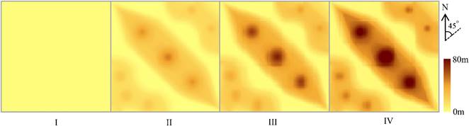 图2.平面和各向异性地形(I:平面;II、III、IV:方位角为 45° 的各向异性地形)