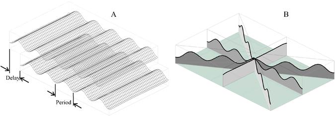 图1. 自相关表面作为信号 (A) 和周期沿方位角随不同的 APS (B) 变化