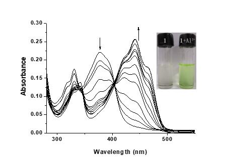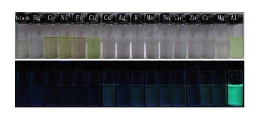 基于上述认识,郝立波教授和臧利斌副教授等人制备了一种简单的荧光探针分子,在弱酸性条件下,该探针分子的溶液与铝离子相互作用后,溶液的颜色会从无色变为黄绿色,颜色随着铝离子浓度增大而加深,直至饱和(Fig.1)。同时,随着铝离子的加入,也可以观察到该溶液从几乎没有荧光发展到具有很亮的绿色荧光(Fig.2)。进一步研究表明,该探针分子对铝离子在颜色变化上没有选择性,但在荧光变化上具有很强的选择性和灵敏性(Fig.3)。同时,研究者还发现该探针分子还具有聚集诱导发光性质和凝胶性质,并利用光谱、核磁共振、理论计算等手段研究了该探针与铝离子的相互作用机制及发光机制。基于上述结果,建立了一种荧光检测铝离子的方法,该方法测定铝离子的检出限为1.039 μM,低于EPA标准规定的7.4μM,表明该方法具有一定的应用价值。