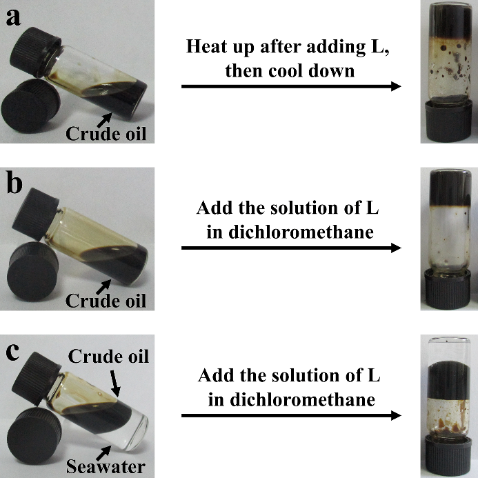 海上石油泄漏会给生态环境带来严重的破坏,虽然目前已经有很多处理石油泄漏的方法,但是往往成本较高或者操作繁琐。针对这一问题,永利yl23411臧利斌副教授等人尝试开发了一种新颖的超分子凝胶剂,该材料能使石油固化。如Fig. 1所示,如果将少量该材料的高浓度溶液直接注入石油中,石油也可以被固化。进一步,研究者将这种方法使用在浮在海水上的石油中,同样能使石油固化。这些结果表明,该策略在海上石油泄漏修复方面具有潜在的应用价值。