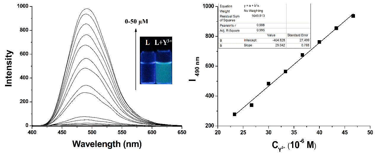 荧光滴定实验表明,在该材料浓度一定的条件下,荧光强度随着钇离子浓度的增加而增强,线性区间为23.3–46.7 μM。同时,该方法测定钇离子的检出限为1.039 μM。