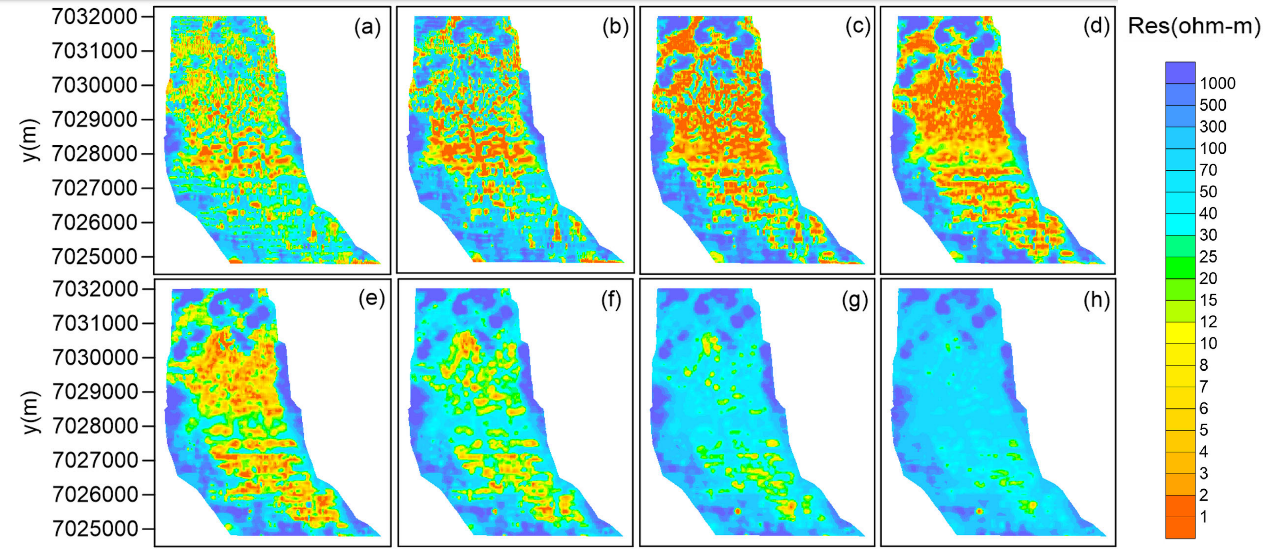 图5 Byneset地区航空电磁实测数据三维反演结果. (a-h)分别对应0,5,11,18,27,37,50,65m深度水平切面.