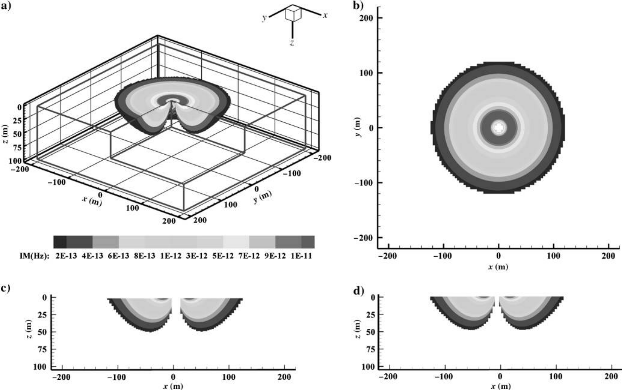 图4 频率域航空电磁系统footprint. (a)footprint三维等值面;(b)footprint x-y切面;(c)footprint x-z切面;(d)footprint y-z切面.