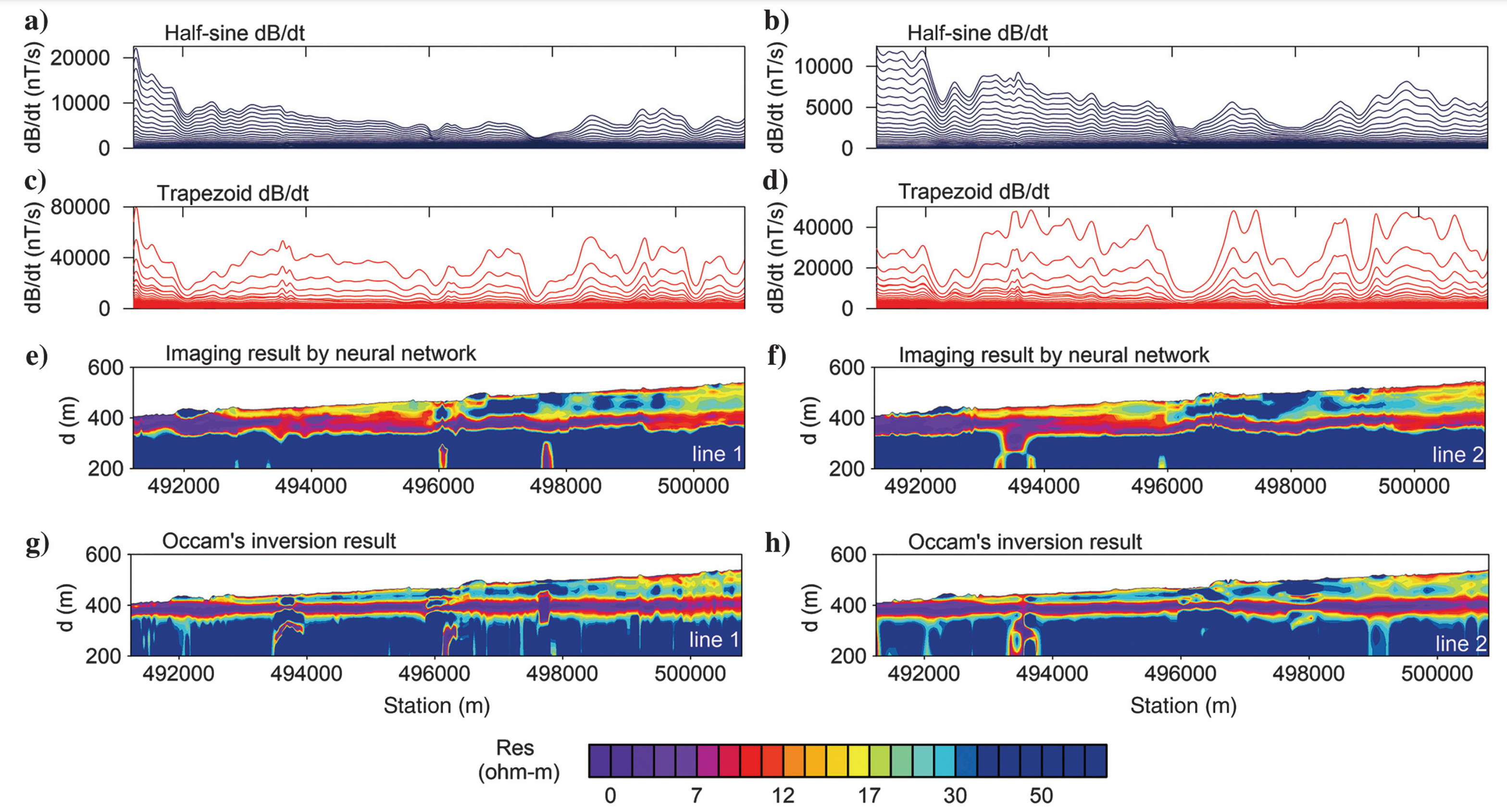 图1 常规Occam反演与机器学习反演对比. (a-b)半正弦发射波型响应对比;(c-d)梯形发射波型响应对比;(e-f)机器学习成像结果;(g-h)Occam反演结果.