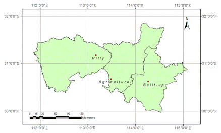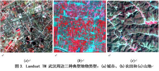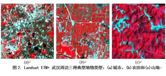 图1.武汉周边三种典型地物类型:城市、农田和山地