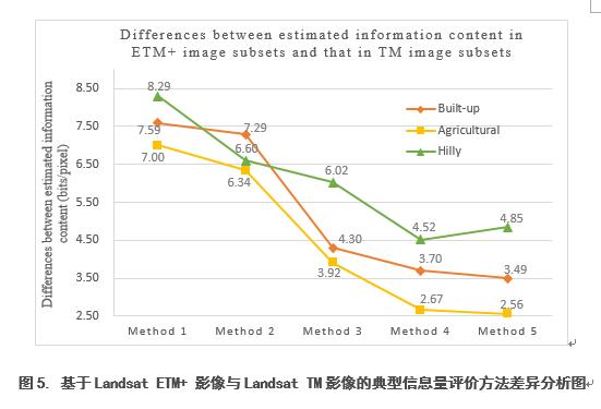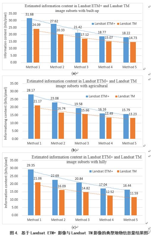 图1-图3为基于Landsat ETM+影像和Landsat TM影像典型地物类型子区域图。研究利用五种典型方法分别度量了两种类型影像的信息量,并对比分析了其差异。所提方法综合利用ICA变换、非正态—正态变换等影像变换,并顾及了空间、光谱和噪声等因素造成的信息冗余。实验结果表明,利用ETM+影像与TM影像子集之间的信息量差异约为3.6比特/像素,表明前者的信息量更大,具体结果如图4和图5所示。研究提出的用于估计多光谱影像信息量的方法对于遥感和地理空间信息处理的信息理论分析意义重大,不仅提供了较为准确的信息度量结果,且易于建立或扩展相关计算程序来实现。