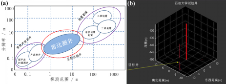 图2 雷达测井探测技术. (a) 探测分辨率与探测深度;(b) 石油大学试验井探测结果三维显示图