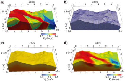 图2复杂三维山地横波速度模型反演.(a)真实模型;(b)有限元网格划分;(c)初始模型;(d)三维反演结果(Liu and Li,Geophysics, 2020)