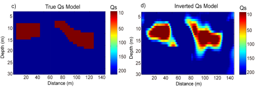 复杂近地表地质条件不但会影响采集参数选择,而且会引起地震波能量被强烈吸收和衰减,导致严重的静校正问题。与深部地层介质的吸收衰减效应相比,近地表介质对地震波高频成分的吸收衰减是降低地震资料分辨率的重要因素,近地表介质对地震波高频成分的吸收约占地层损耗总量的80%。申请人利用骨架反演思想,通过拾取地震信号频谱峰值频率作为骨架数据开展Q值波动方程骨架反演。理论模型和实测数据均验证了该方法对速度模型依赖低、在近地表Q值估计中具有较高的反演精度(Li et al, 2017, GJI)。