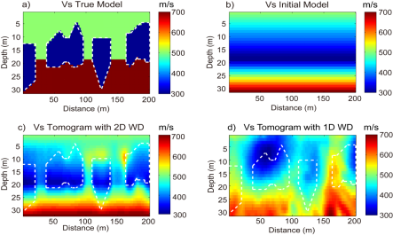 (1)在面波反演方面,常规频散曲线反演基于一维层状介质假设,对于横向变化大的近地表复杂结构难以获得高分辨率的探测结果;面波全波形反演(FWI)在近地表低信噪比地震数据应用中具有挑战性,最新发展的多尺度、包络目标函数、频率域等改进FWI算法也难以完全克服子波估计差、初始模型依赖、目标函数非线性、周期跳跃等问题。