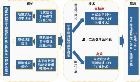 在该项研究中,结合地震波动理论、随机统计理论、自适应预测滤波理论和数学正则化反演理论,形成交叉学科研究框架,对非平稳地震复杂同相轴的局部能量表征进行了深入研究,在自适应预测滤波理论、技术和应用方面形成了完整的体系(图1)。