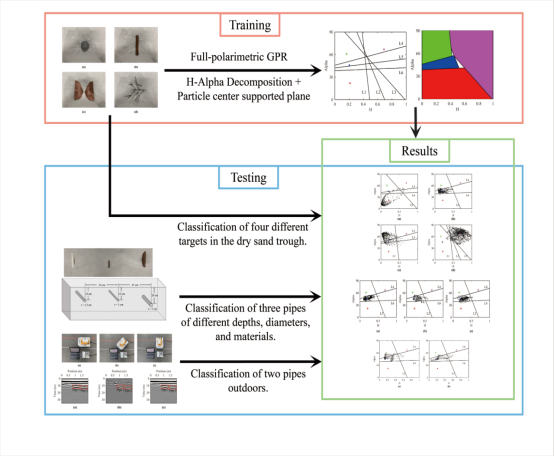 尽管新的模板能更好的适应探地雷达地下探测的应用场景,但是分类模板的建立仍然是以极化雷达遥感技术为基础进行修正而来。候选人引入机器学习方法,针对地下目标干扰较大的问题,采用粒子中心算法改进了支持向量机技术,发展了粒子中心支持平面算法,研发了以数据为基础建立H-Alpha分类模板的技术(Xuan Feng et al., Remote Sensing, 2019),摆脱了雷达遥感机制的限制,极大提高了对地下管状目标的分类识别精度。