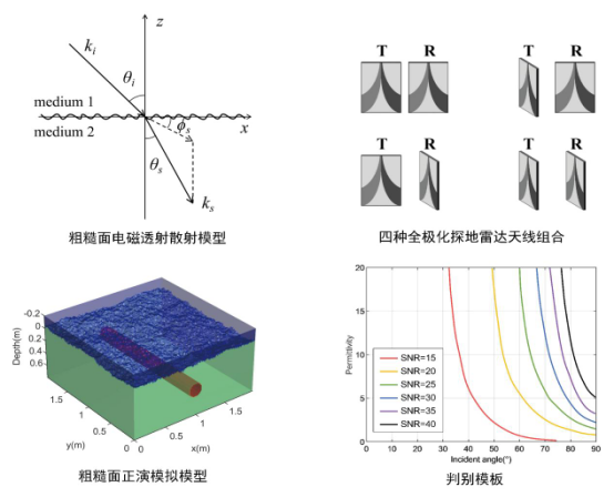 考虑到极化雷达遥感技术主要针对地面目标,而探地雷达主要针对地下目标。深入研究了雷达波在地下复杂介质中的传播特征,揭示了雷达波在地下传播过程中的极化旋转机制(ZeJun Dong, Xuan Feng* et al., IEEE TGRS, 2021),发现了地下粗糙界面影响雷达波极化方向的定量规律。雷达波在地下传播过程中会遇到较强的衰减和干扰,反射或散射带回的极化旋转信息的信噪比相对较弱。在分析雷达波地下传播机制和详细计算不同能量噪音干扰的基础上,研发了针对地下目标的新的H-Alpha分类模板(Yue Yu, Chi-Chih Chen, Xuan Feng* et al., IEEE J-STARS,2017)。与传统的H-Alpha分类模板相比较,能更好的适应强干扰环境下的地下目标分类识别。