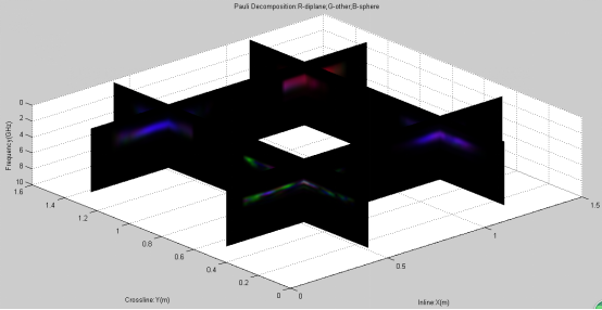 在此基础上,计算了地下目标的Pauli特征矢量和Lexicographic特征矢量,引入了H-Alpha分解和Freeman分解技术,融合探地雷达偏移成像技术,建立了以地下目标散射矩阵的相干矩阵和协方差矩阵分析为核心的,全极化探地雷达地下目标极化属性分析技术。研发了全极化探地雷达Freeman分解算法(Xuan Feng et al., Signal Processing, 2017),和全极化探地雷达H-Alpha分解算法(Xuan Feng et al., IEEE TGRS, 2015;Zejun Dong, Xuan Feng* et al., IEEE TGRS, 2021)。传统探地雷达主要依靠反射剖面形态来区分地下目标,对于形态近似目标以及微小尺度结构难以区分识别。而新的技术在传统反射剖面的基础上,利用RGB色彩等技术增加了新的极化旋转信息的表达,展现出了对形态近似目标以及微小尺度结构更好的分类识别能力,较大的提高了探地雷达的地下目标分类识别能力。