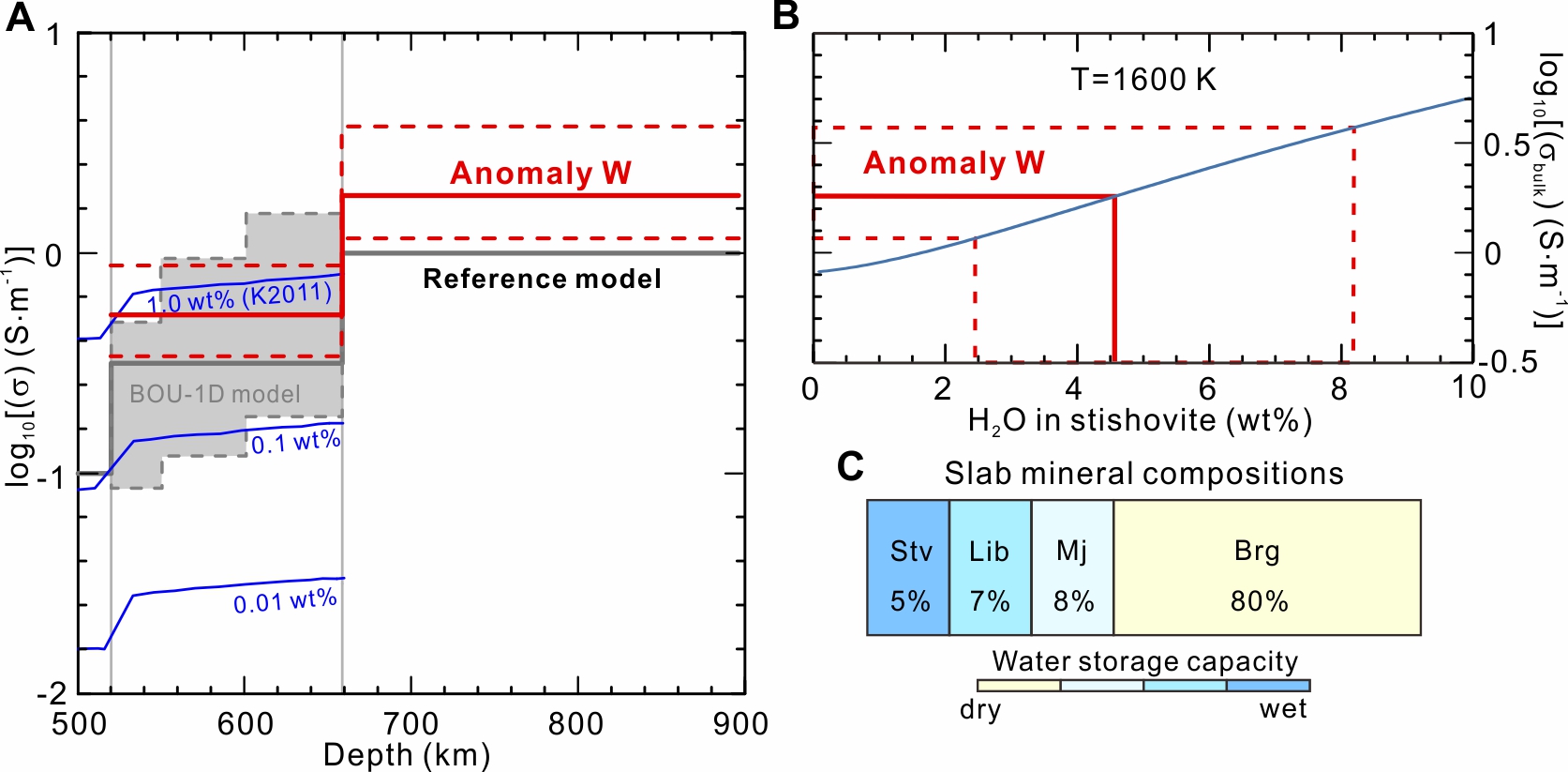 2)该高导异常体是由地幔高的含水量所引起。其中,地幔转换带中的高导异常体应是由含水林伍德石(Ringwoodite)的存在(其含水量可能高达1 wt.%;图2A),而下地幔顶部的异常体则应归因于含水斯石英(Stishovite)的存在,其平均含水量可能达到4.5 wt.% (图2B,2C)。