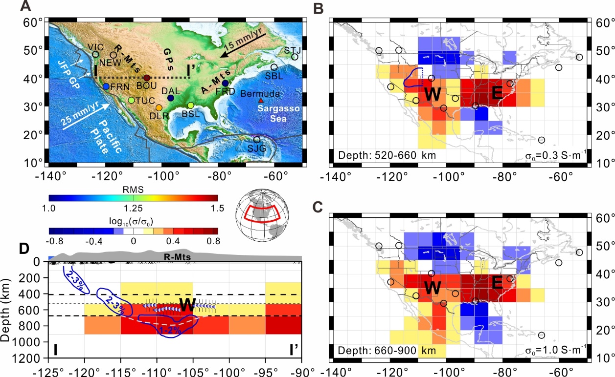 1)发现了北美西部地区下方地幔转换带和上地幔顶部附近存在一个显著的高导电异常体(图1),其中下地幔顶部的高导异常体与滞留的法拉隆板块位置相重合。