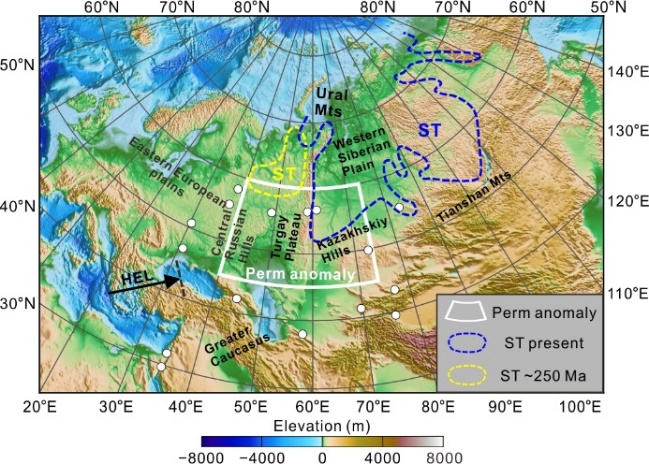 2) 发现高温PEC异常体与核幔边界附近的地震波速度低速PERM异常和地表的西伯利亚大火成岩省在空间上密切相关。该结构为构建古老的西伯利亚地幔柱存在提供了关键的地球物理证据——该地幔柱从核幔边界形成、浮力上升后与地幔转换带相互作用,最后穿透转换带进入上地幔并最终形成二叠纪末西伯利亚大火山岩省。