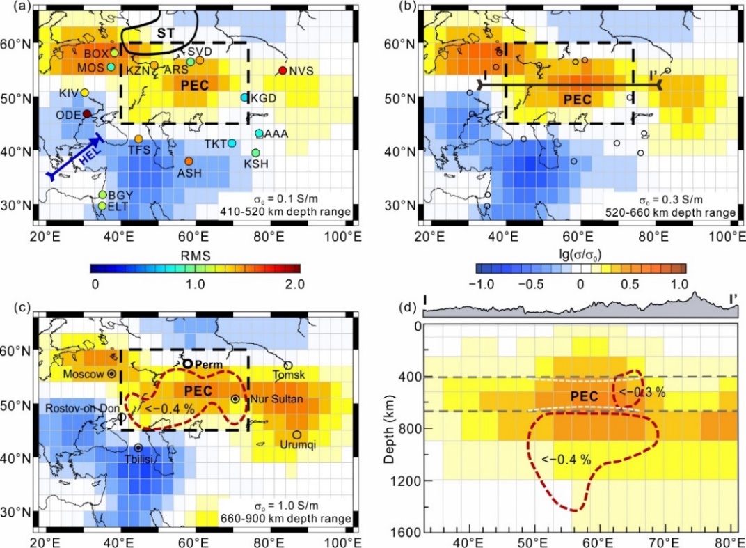 1) 发现了Perm地区下方的地幔转换带附近显著的高导电异常(PEC;图2)。岩石物理分析表明,该异常由高温所致,该高温进一步导致地幔转换带轻微的部分熔融,这暗示着此处曾经发生过地幔柱穿过地幔转换带。因此,该PEC异常应是地幔柱与地幔转换带相互作用后的遗迹。