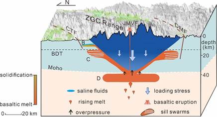 3. 研究结果表明,该板内单成因火山的岩浆传输体系是整个低阻异常体构成了一个源自岩石圈地幔顶部的碟状侵入体,并认为张广才岭的山根、地形加载作用、地壳的流变结构以及周围的岩石圈断裂共同控制了镜泊湖板内单成因火山的跨地壳碟状岩浆传输系统(图3)。