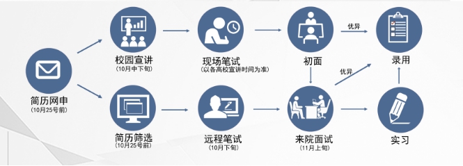 远程笔试:未参加校园宣讲现场笔试的,经简历筛选后,择优通知远程笔试,考试时长约1周,试题及答题要求以邮件形式发送至简历邮箱。