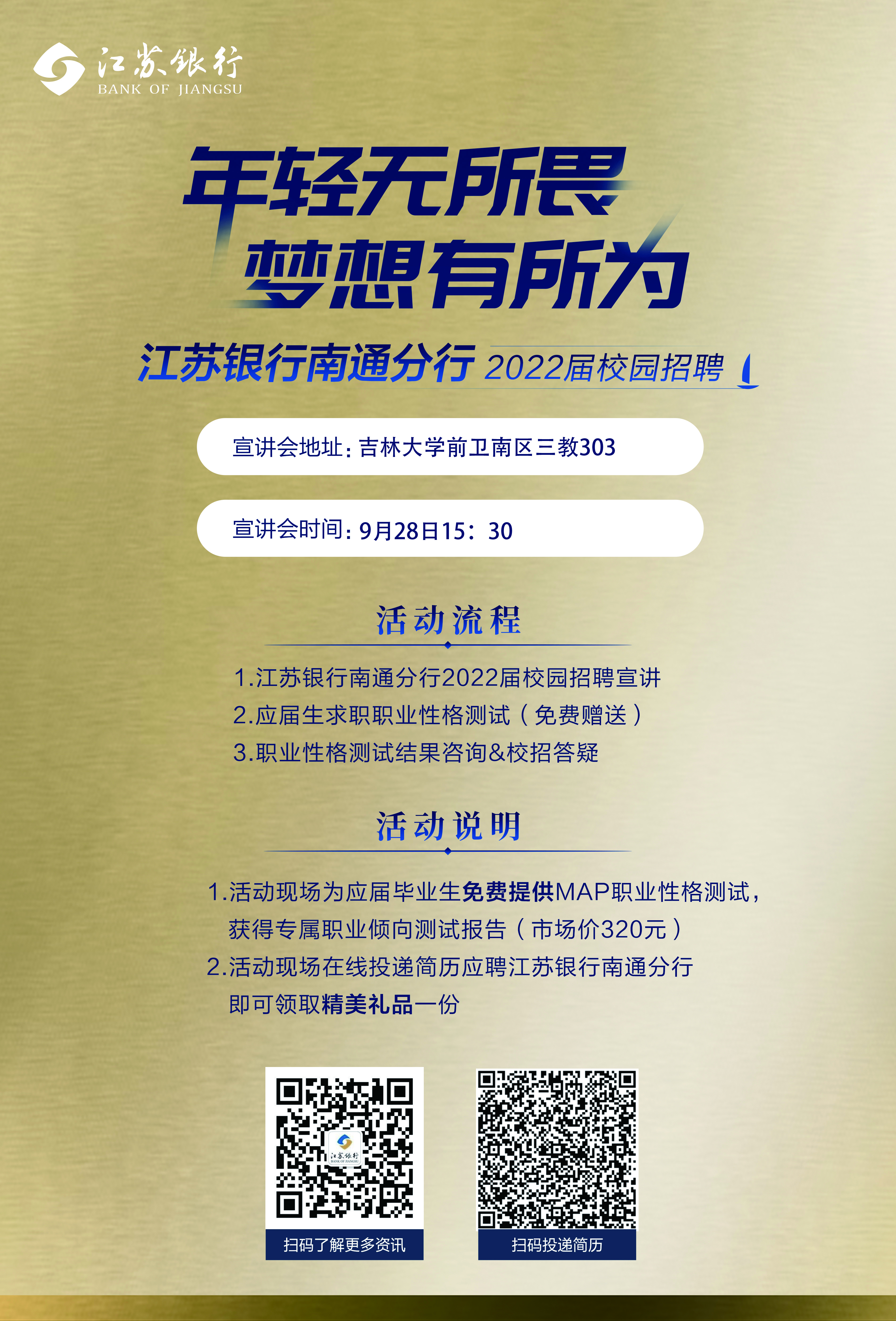 【江苏银行南通分行2022届校园招聘宣讲-永利yl23411校园招聘会】活动内容:- 银行业发展趋势探讨- 江苏省、南通市发展前景预览- 江苏银行南通分行特色优势介绍现场可免费参与独家职业性格测试,获得专属测评报告,为择业提供参考,还可向专业HR一对一咨询。现场投递简历更可获得精美礼品一份。时间:9月28日 15:30-17:00地点:前卫南区三教303欢迎吉大学子现场咨询交流!