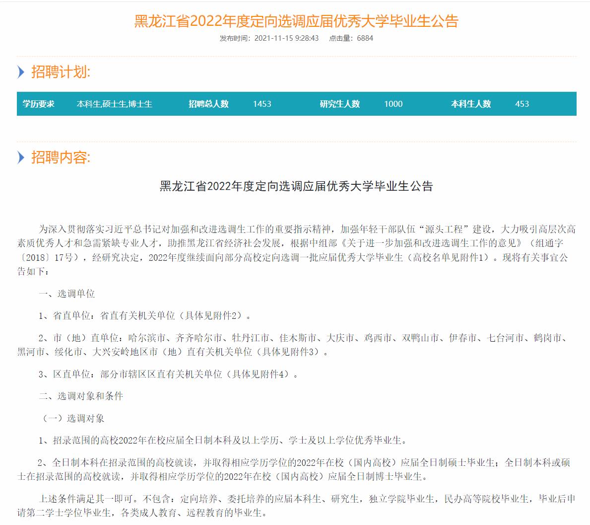 【2021招聘信息228】黑龙江省2022年度定向选调应届优秀大学毕业生