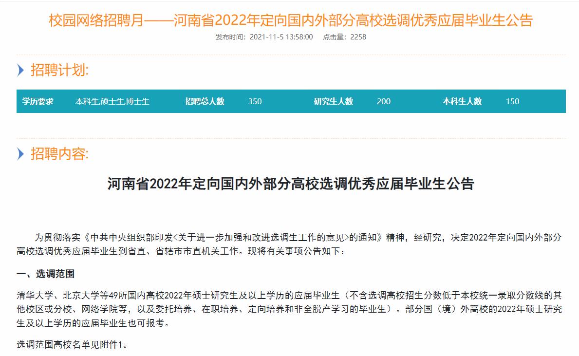 【2021招聘信息231】河南省2022年定向国内外部分高校选调优秀应届毕业生