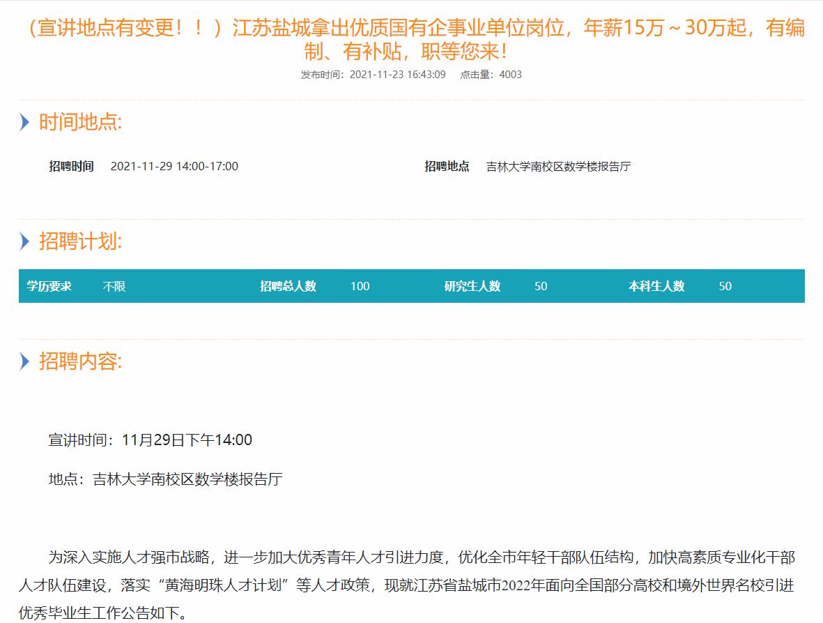 (宣讲地点有变更!!)江苏盐城拿出优质国有企事业单位岗位,年薪15万~30万起,有编制、有补贴,职等您来!