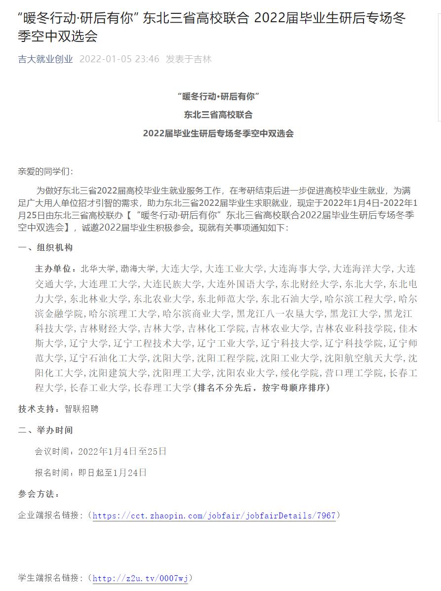 “暖冬行动·研后有你” 东北三省高校联合 2022届毕业生研后专场冬季空中双选会