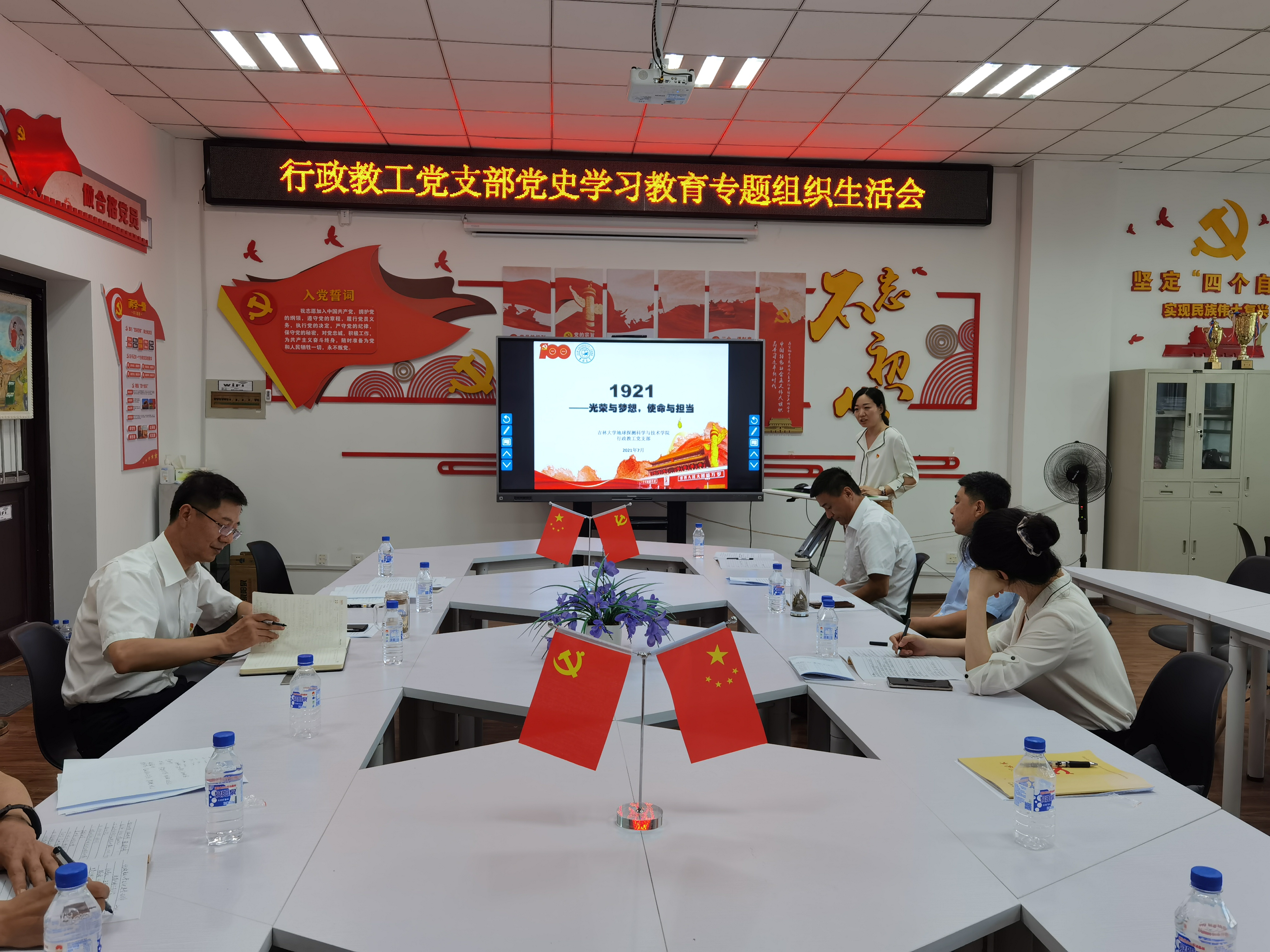 组织生活会后,支部书记王郁涵为支部党员作了《1921——光荣与梦想,使命与担当》党课,并重温入党誓词。