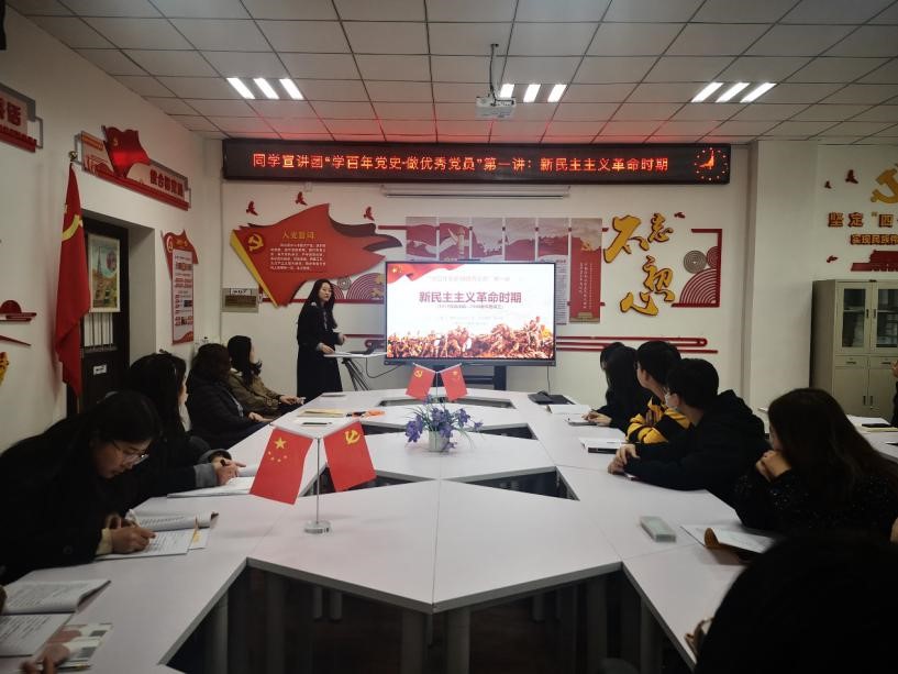 首先,高若云同志向党支部成员介绍了本次支部活动的主要内容以及近期活动安排:党员自主系统学习党的历史,深入学习习近平总书记在党史学习教育动员大会、庆祝中国共产党成立100周年大会、党史学习教育总结大会上的重要讲话精神,高质量完成学习目标,做好学习笔记;开展集中学习研讨,以党小组形式进行“同学宣讲团”,并交流分享心得体会等。其后,高若云同志作为第一党小组代表进行了新民主主义革命时期的党史展示和宣讲,对新民主主义革命时期的五个阶段进行了介绍:新民革兴起、国民大革命时期、土地革命时期、全民族抗日时期和解放战争时期。通过介绍五个阶段中的代表性事件,结合相关的影视资料,讲述了我们党探索出农村包围城市、武装夺取政权的正确革命道路,“唤起工农千百万”“夺过鞭子揍敌人”,经过土地革命战争、抗日战争、解放战争,推翻了压在中国人民头上的帝国主义、封建主义、官僚资本主义“三座大山”,建立了人民当家作主的中华人民共和国,彻底结束了近代以来中国内忧外患、积贫积弱的悲惨境地,开启了中华民族发展进步的新纪元。