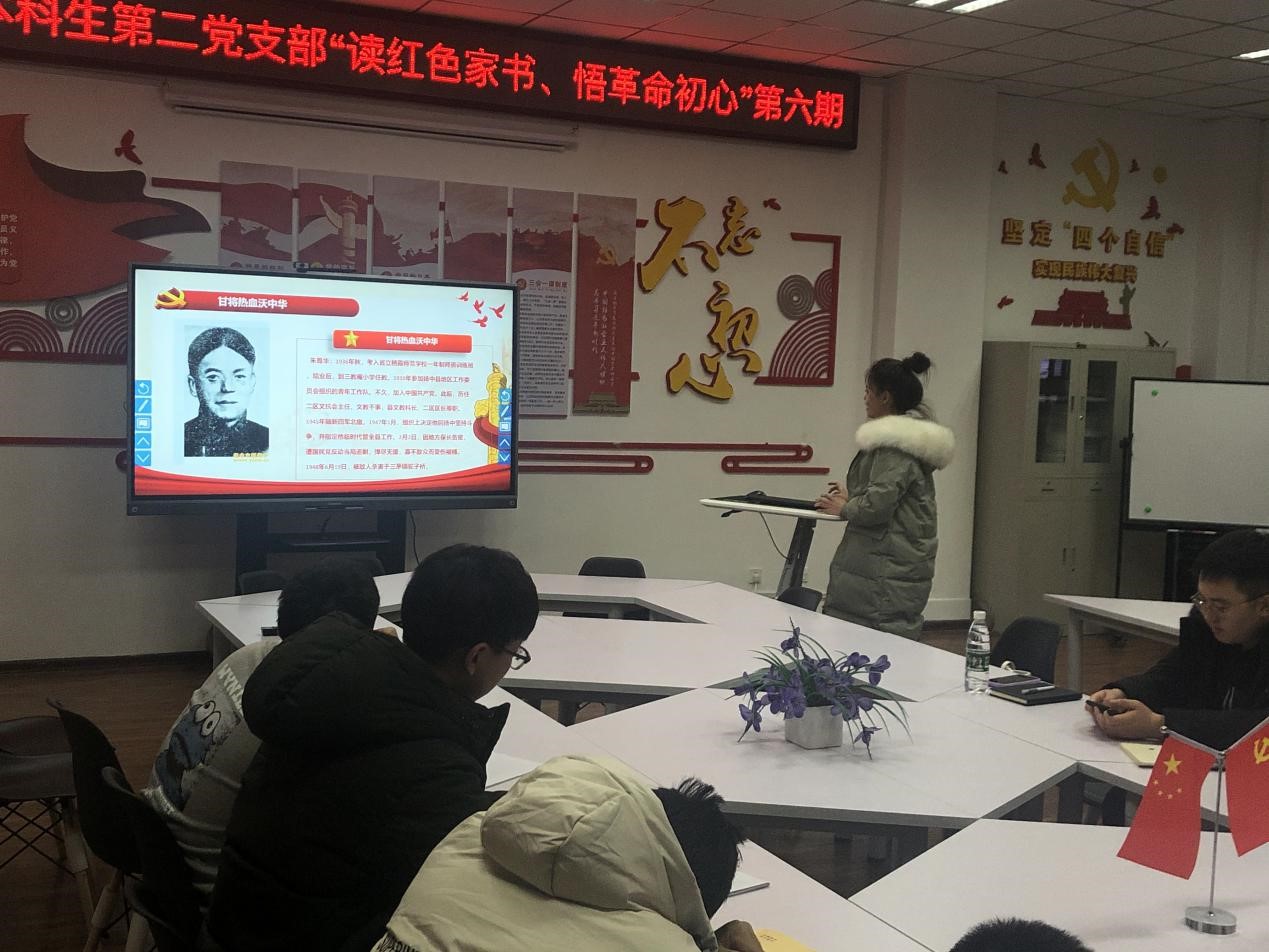 2020年12月17日,永利yl23411本科生第二党支部在于地质宫403党员活动室开展第六期“读红色家书,悟革命初心”主题党日活动,党日活动由司镇通老师主持,支部全体党员参加。