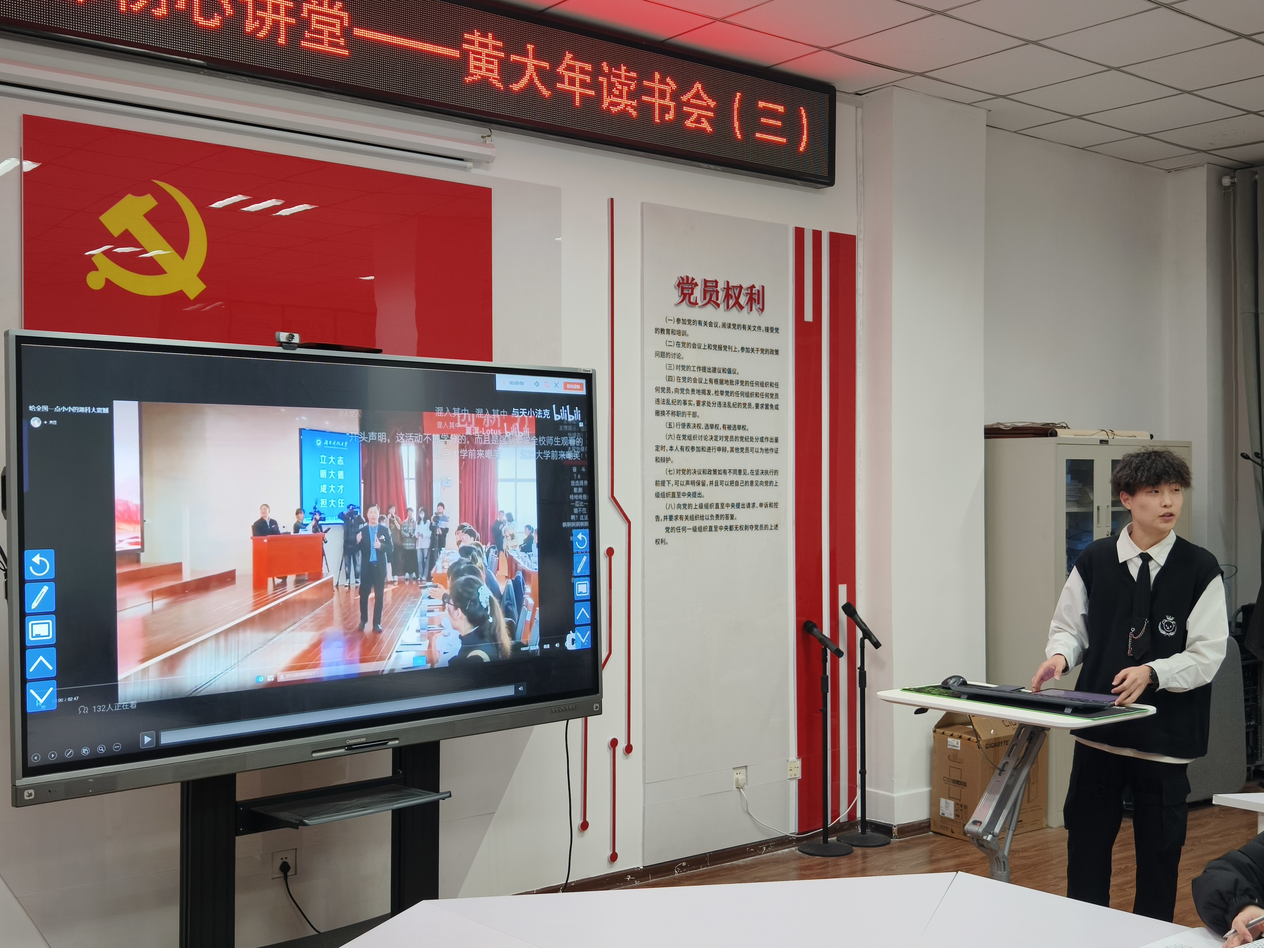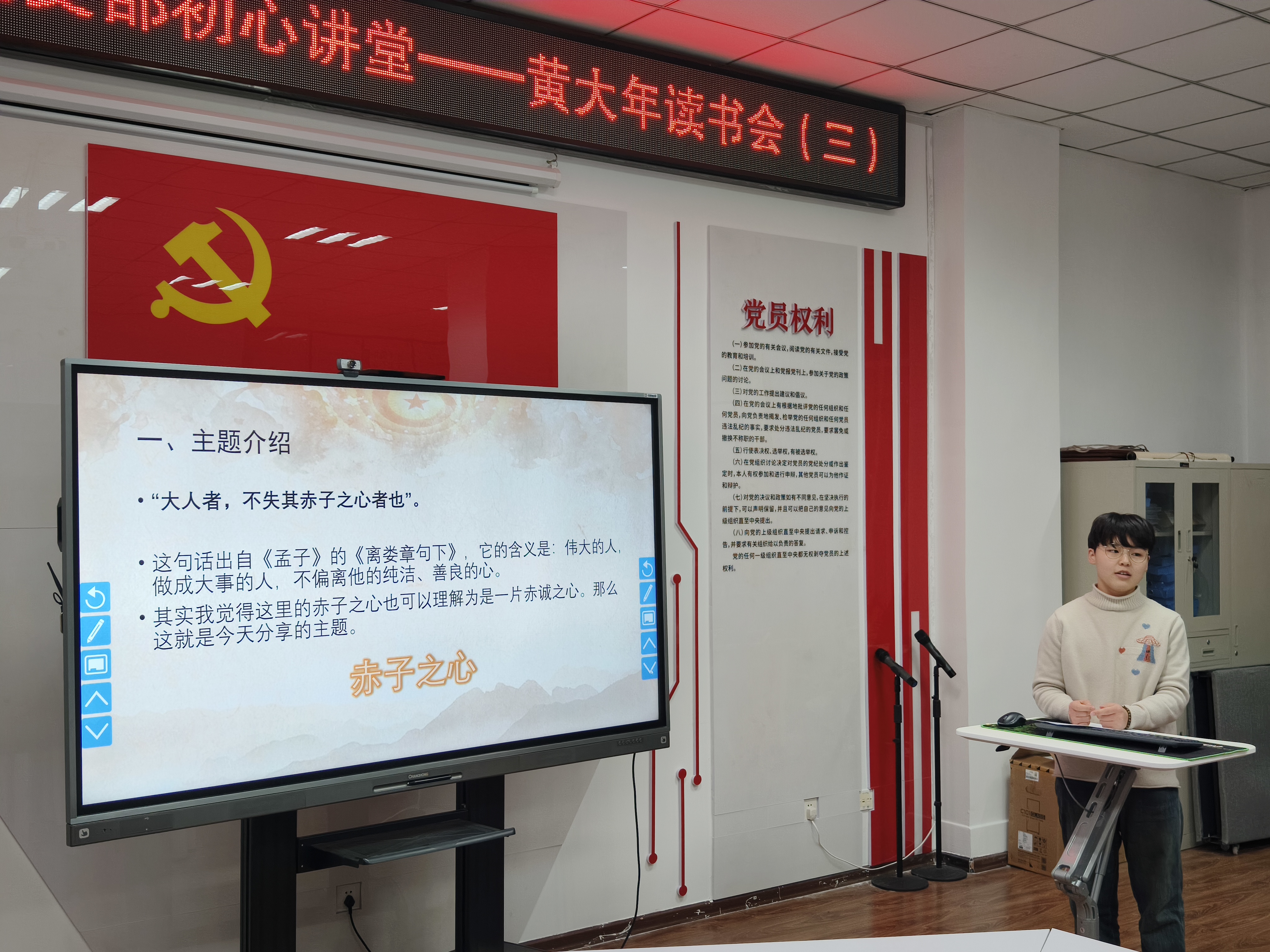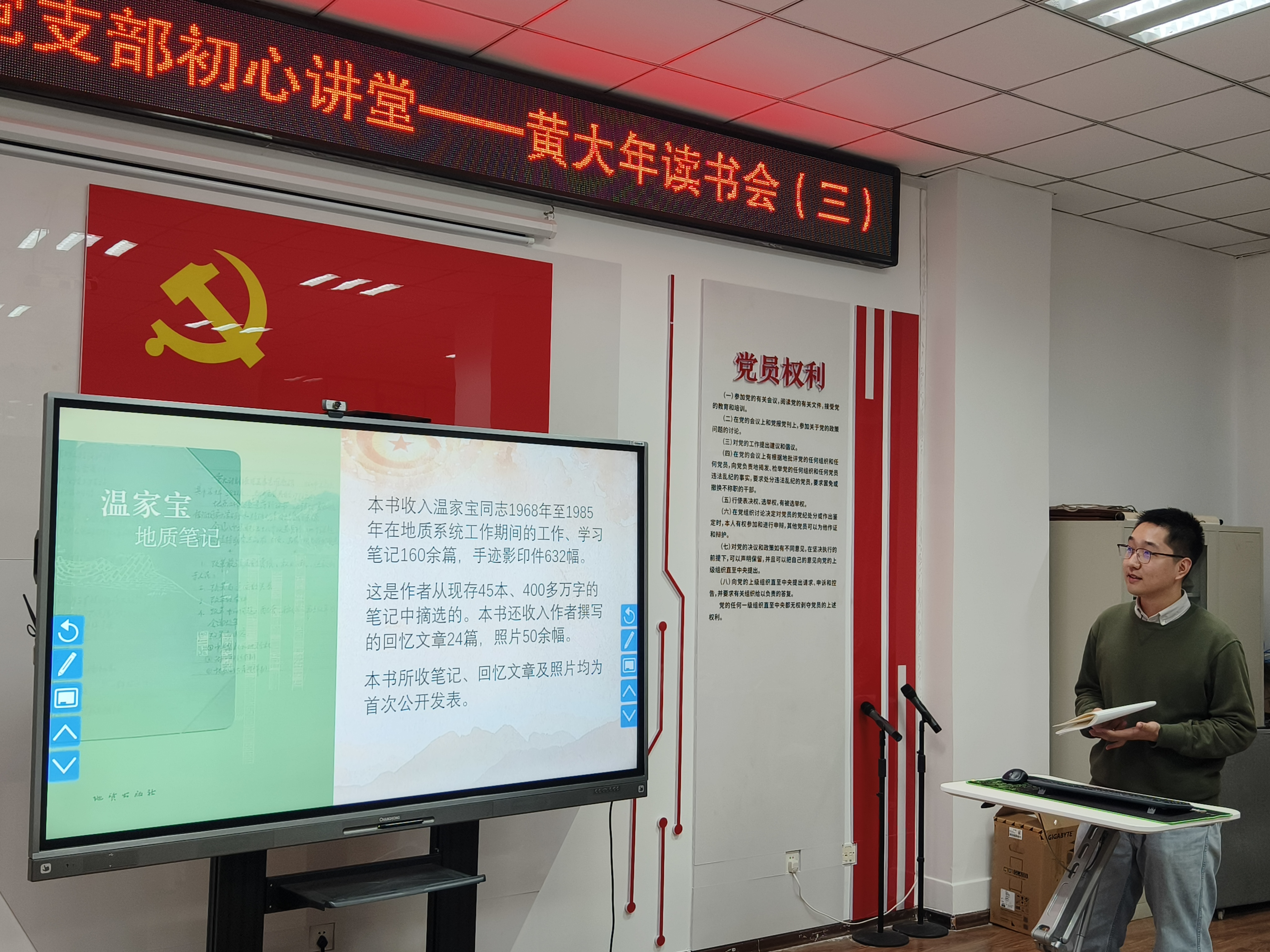 11月30日18:30,永利yl23411本科生第一党支部于地质宫403室举办了“初心讲堂”:黄大年读书会第三讲。本次活动由支部书记王洪宇老师主持,党支部第三党小组进行分享,党支部全体党员参加。本期读书会以书籍《温家宝地质笔记》和《黄大年:给地球做CT检查的科学家》为主题,分享了两位地学前辈的故事。