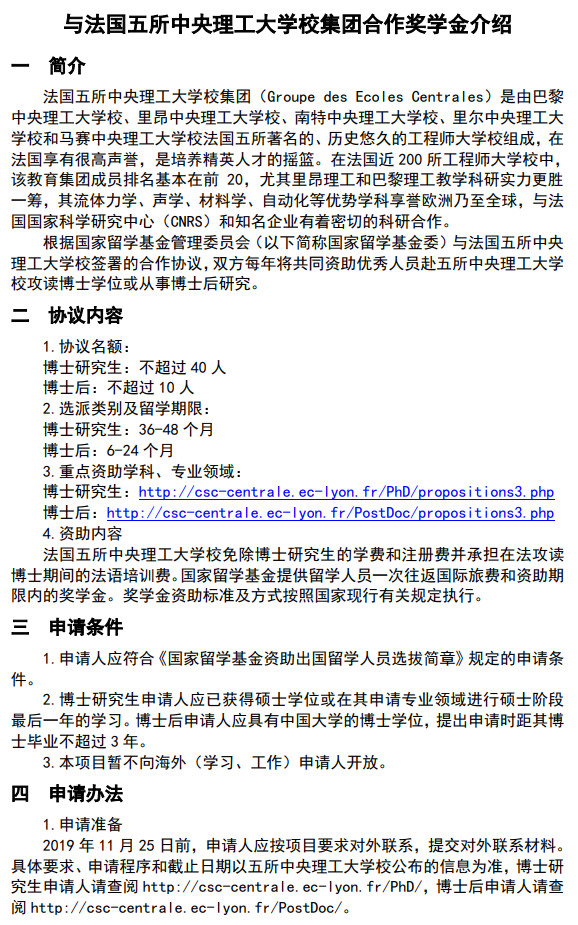 法国五所中央理工大公司集团(Groupe des Ecoles Centrales)是由巴黎中央理工大公司、里昂中央理工大公司、南特中央理工大公司、里尔中央理工大公司和马赛中央理工大公司五所法国著名的、历史悠久的工程师大公司组成,在法国享有很高声誉,是培养精英人才的摇篮。根据国家留学基金管理委员会与法国五所中央理工大公司签署的合作协议,双方每年将共同资助优秀人员赴五所中央理工大公司攻读硕士学位、博士学位或从事博士后研究。