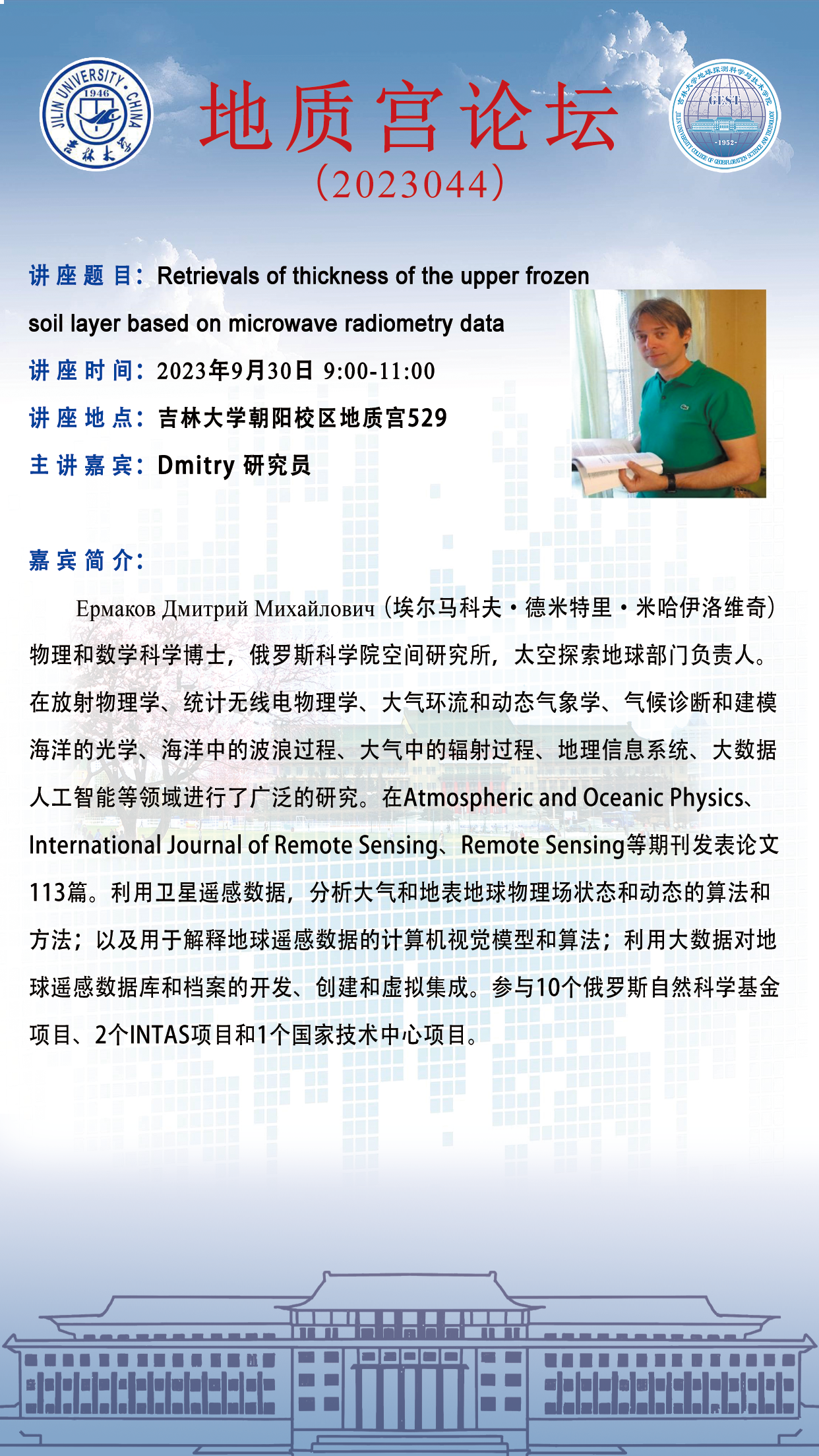 永利yl23411·地质宫论坛(2023044)—俄罗斯科公司空间研究所Dmitry 研究员学术报告