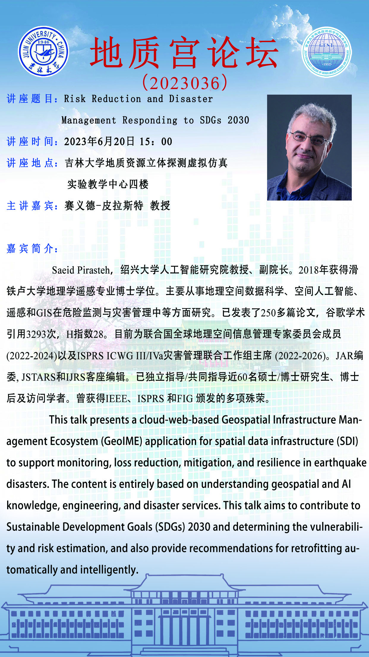 永利yl23411·地质宫论坛(2023036)—绍兴大学人工智能研究院Saeid Pirasteh教授学术报告