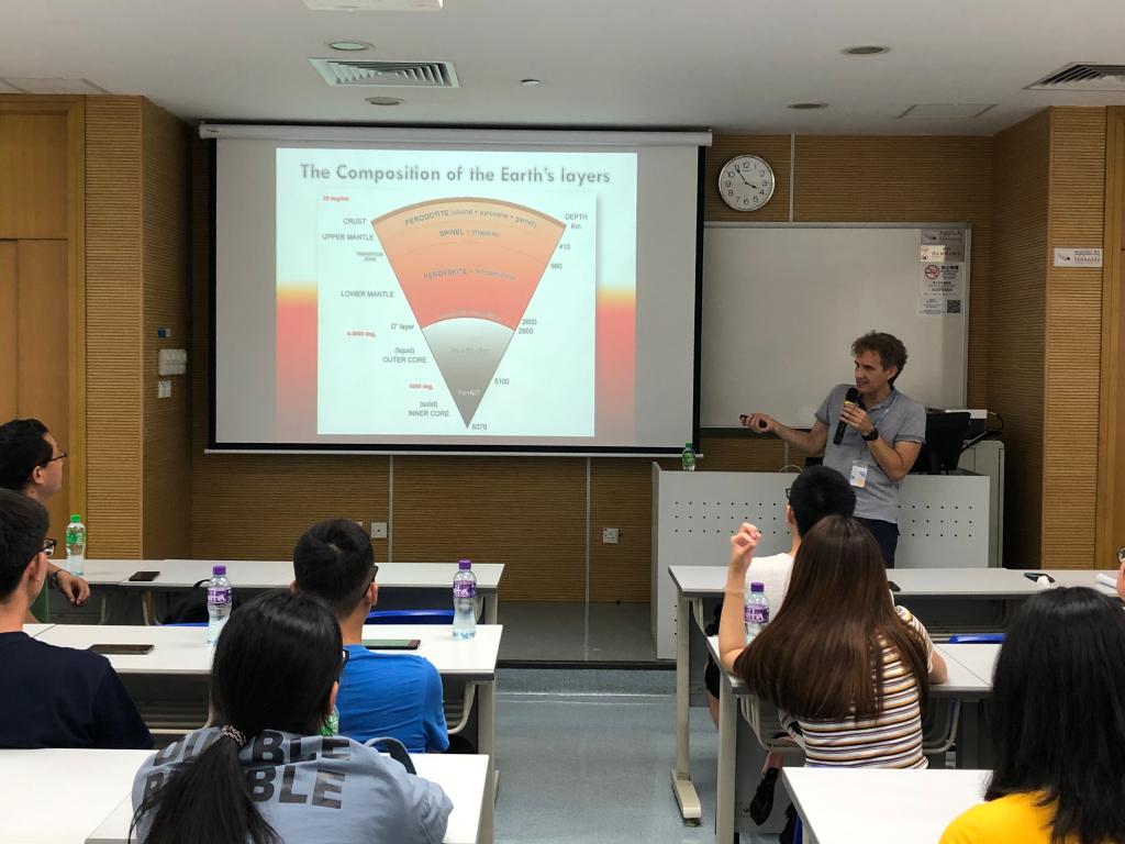在专题报告后,助理教授Roberto Bugiolacchi为公司师生作了题为《A Geological Journey---From Plank to Rock and Back》的学术报告,Roberto Bugiolacchi助理教授从地球上三类岩石出发,由宏观到微观向同学们介绍了各种主要元素、矿物在宇宙及地球内部的形成和分布,并通过追溯宇宙大爆炸发生之前宇宙的状态,说明了每块岩石从无到有经历的过程所包含的都是万千宇宙,他以热情风趣的演讲、极为独特的科研视角带给了访学团队师生们对地质学与宇宙关系的新理解。