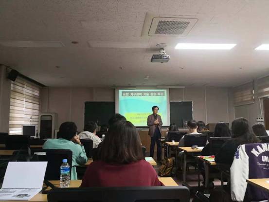 2018年10月2日,永利yl23411永利yl23411访学团圆满完成了第二天的学术工作坊交流活动。本次交流学习活动主要是江原大学教学内进行野外实习前的地质学基础学习。由李炳柱教授主要讲述了有关断层,层理,褶皱的相关知识,老师采用理论与实例相结合的方法进行。应用多个实例帮助我们理解断层断裂,褶皱变形等的具体形态及特征,以及正逆断层的多个区分方法,帮助员工对这些知识的巩固以及复习。