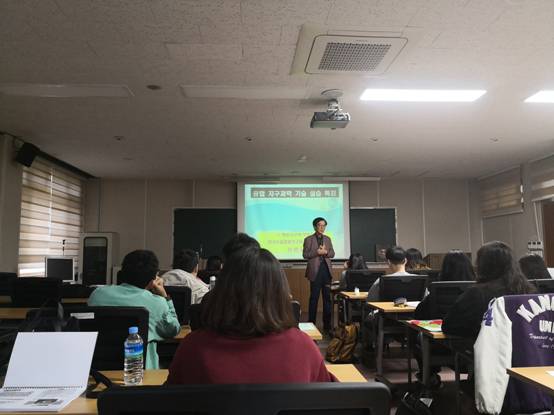 2018年10月1日,访学团与韩国江原大学地球物理系的大三员工共同进行地球物理专业实习前相关地质知识的学习。相关课程由韩国地质资源研究院名誉研究员李炳柱教授进行,主要讲解了有关地球生成及地质年代演化的过程。并介绍了三大岩类的特征。
