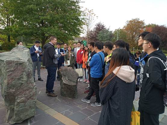 报告结束后,访学团在地调局年轻地质学家Steve Parry的带领下,实地参观学习了BGS代表性的“地质走廊”(The BGS Geological Walk),该地质走廊全长130米,设计巧妙,将各年代岩石按顺序铺设在路面上,并且在各年代间隔处摆立具有代表性岩石。Steve Parry教授详细认真地结合地质走廊的各年代岩石标本向同学们讲解了从前寒武纪至今的各类岩石,以及相关的地质知识。